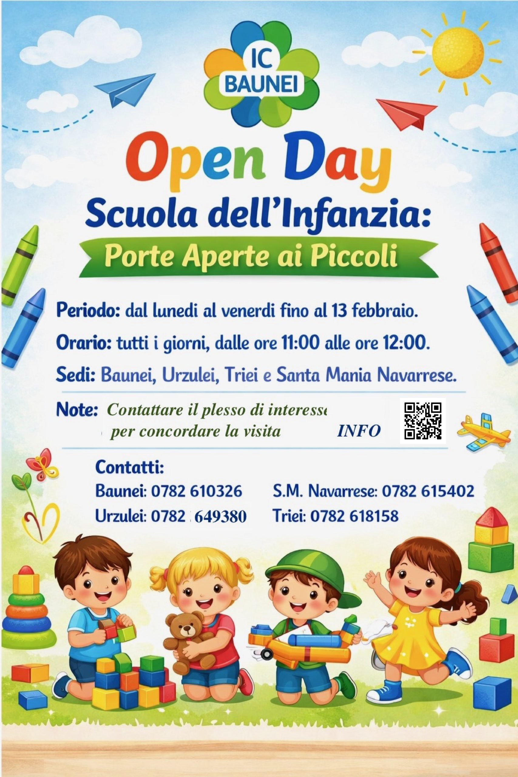 Per le nuove iscrizioni alla Scuola dell’Infanzia, i plessi del nostro Istituto saranno aperti per visite guidate e colloqui informativi. Gli Open Day rappresentano un’occasione preziosa per esplorare gli spazi didattici, conoscere l’ambiente scolastico e interagire direttamente con il personale educativo. In tale occasione, i futuri alunni avranno la possibilità di partecipare a brevi attività ludiche e creative insieme ai compagni più grandi, per un primo approccio sereno alla vita scolastica.